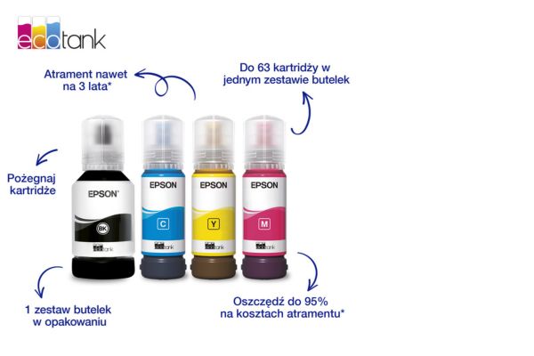 Zastosowany system stałych zbiorników na atrament EcoTank oraz technologia druku niewymagająca wysokich temperatur przekładają się na bardzo niskie koszty eksploatacji i mniejsze zużycie energii. Jeden zestaw butelek wystarcza nawet na 8500 stron w czerni i 6500 stron w kolorze.