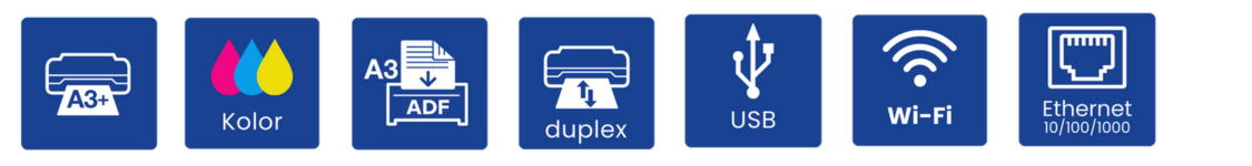 Ekonomiczne i wydajne kolorowe urządzenie wielofunkcyjne A3+ dla dla małych i średnich zespołów roboczych. Drukowanie, skanowanie, kopiowanie, faks. Duplex i ADF. USB, Ethernet i Wi-Fi.