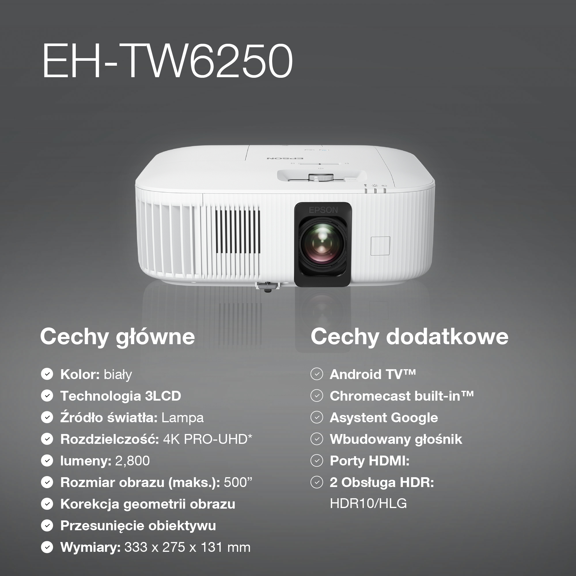 EPSON EH-TW6250 to propozycja dla użytkowników domowych poszukujących alternatywy dla dużego telewizora, którzy docenią elastyczność i prostotę instalacji, wysoką jakość obrazu oraz funkcje smart.