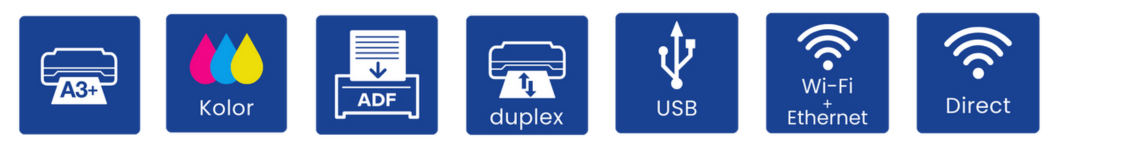 Szybkie i wydajne kolorowe urządzenie wielofunkcyjne A3+, dla firm i profesjonalistów, duże podajniki, duplex i ADF. USB, Ethernet i Wi-Fi. Drukowanie, skanowanie, kopiowanie, faks.