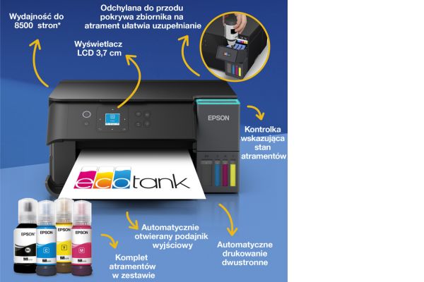 Dzięki innowacyjnym rozwiązaniom takim jak stałe zasilanie atramentem EcoTank oraz bardzo niski pobór mocy za sprawą głowicy nie wymagającej wysokich temperatur w trakcie drukowania urządzenie jest bardzo ekonomiczne w eksploatacji. Na jednym zestawie butelek można uzyskać nawet do 8500 stron wydruków czarno-białych i do 6500 stron w kolorze.