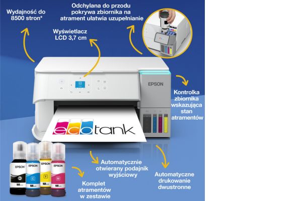 Stosowana w urządzeniach EPSON technologia EcoTank wykorzystuje system uzupełniania dużych pojemników atramentowych, zamiast klasycznych kartridży. To system znacznie wygodniejszy w obsłudze i przede wszystkim tańszy w eksploatacji urządzenia. Dużo rzadziej trzeba uzupełniać atrament. W tym modelu np. wydajne butelki z atramentem wystarczają na 8 500 wydruków mono oraz 6 500 stron kolorowych, dzięki czemu użytkownik może długo pracować i cieszyć się niskimi kosztami. Sama procedura uzupełniania atramentu jest łatwa i szybka i bez ryzyka pomyłki przy napełnianiu poszczególnych pojemników.