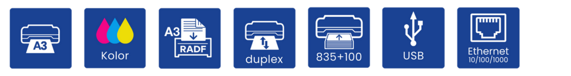 Zaawansowane i wydajne kolorowe urządzenie wielofunkcyjne dla małych i średnich grup roboczych obsługujące drukowanie, skanowanie, kopiowanie w kolorze A3 oraz faks. Szafka plus podajnik.