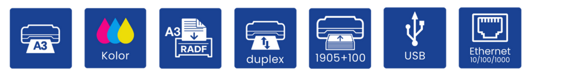 Zaawansowane i wydajne kolorowe urządzenie wielofunkcyjne dla małych i średnich grup roboczych obsługujące drukowanie, skanowanie, kopiowanie w kolorze A3 oraz faks.Trzy dodatkowe podajniki.